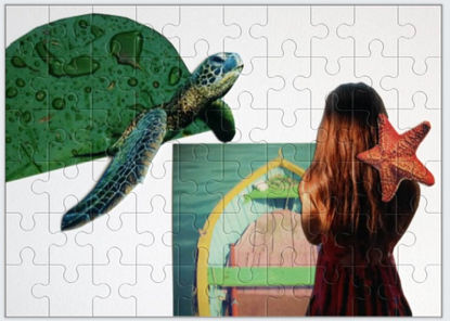 Trabalho em formato de livro brincante. As imagens contam uma história; falam da descoberta, do espírito de aventura, do movimento da vida. A releitura de uma menina que busca seu caminho através do imaginário. As imagens em quebra-cabeça fazem parte da narrativa que é caótica e cheia de "testes", como na vida.